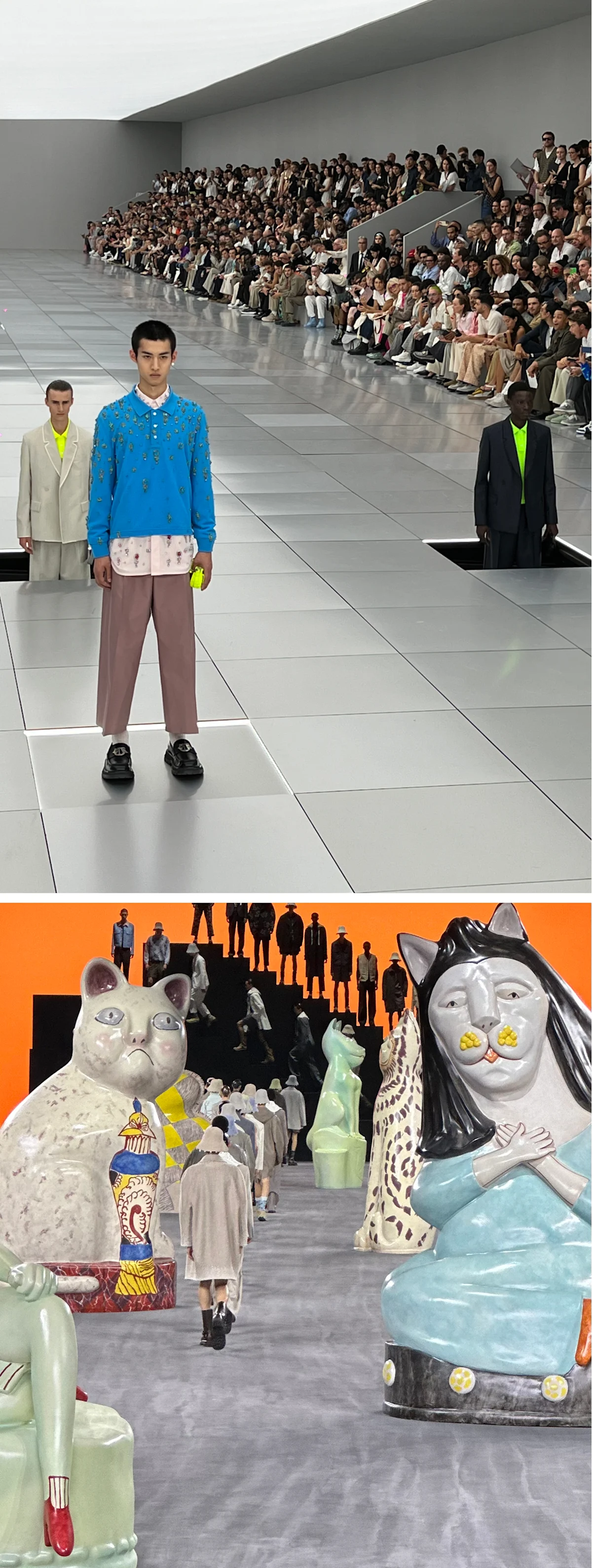 ⎯⎯⎯ In terms of Kim, one of the peculiarities of my music supervision is that it's one component of my consulting work. Over the last few years, I’ve effectively been moving around as part of the Kim Jones Studio. I'm therefore privy to the inception of a collection because I’ve been in the room with him and his colleagues in the design departments when they’re in the research stage, when the first samples come back, when they're styling. This allows us to have informal conversations, where we might talk about what music is playing in the room when they're working, which can be quite telling. It might be a recurring track or series of tracks which end up defining the process and therefore the collection, and might even end up in the show mix further down the line. Perhaps quite exceptionally, with Kim, I also have the privilege of looking at the fashion show moment in a holistic manner, both in terms of being present for these design conversations, but also leading on communication between him, the production company, and the fashion house on the show set design. This whole process will take several months to half a year, up to the point where I'm on location with the production company as the set is being installed and talking to a sound technician about how the music should be presented and if we need some special requirements for that playback.